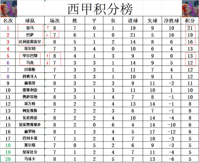 积分榜方面,皇马及时止住颓势后,先赛的他们超过巴萨2分夺回榜首,输球的比利亚雷亚尔则是还差巴萨3分仍然排在第3。毕尔巴鄂竞技前段时间战绩相当的惨淡,双线1平5负连续6场不胜,今天终于是赢球止住颓势,在那时超过马竞1分升至第5。