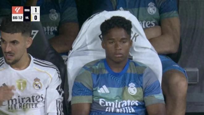 比赛第67分钟,镜头捕捉到恩德里克独自坐在替补席上,面无表情、情绪低沉。据西班牙《阿斯报》报道,这位巴西新星目前的心理状态并不理想,主要原因是他持续无法获得出场机会。