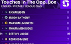 英超第5轮对方禁区触球榜:理查利森11次最多 杰顿-安东尼9次第二